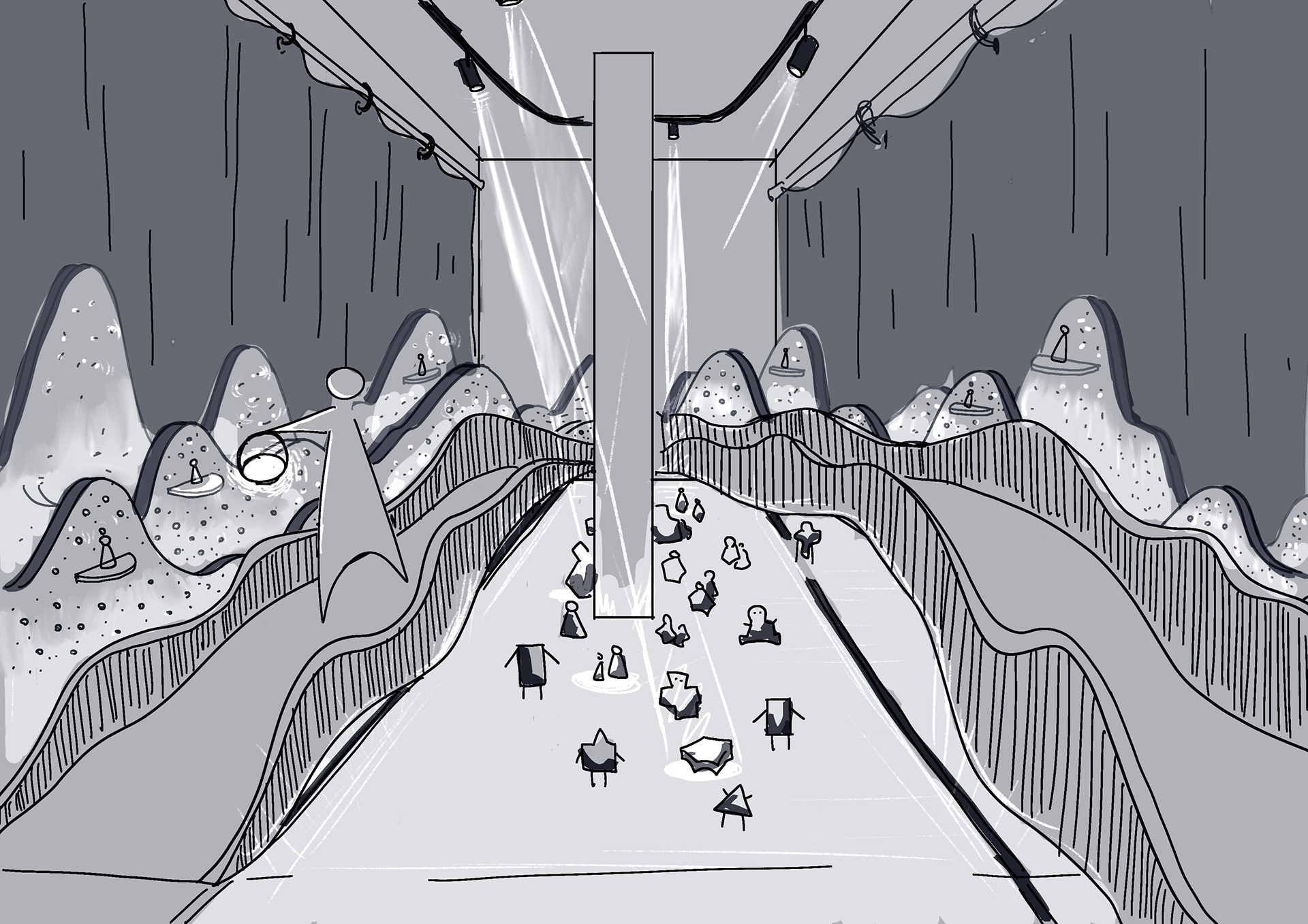 To create a similar environment, inspired by the artist Yongliang, the windows of the exhibition hall are covered with semi-transparent fabric and mountain shaped mesh panels that would serve as sun breakers while mimicking the stars.