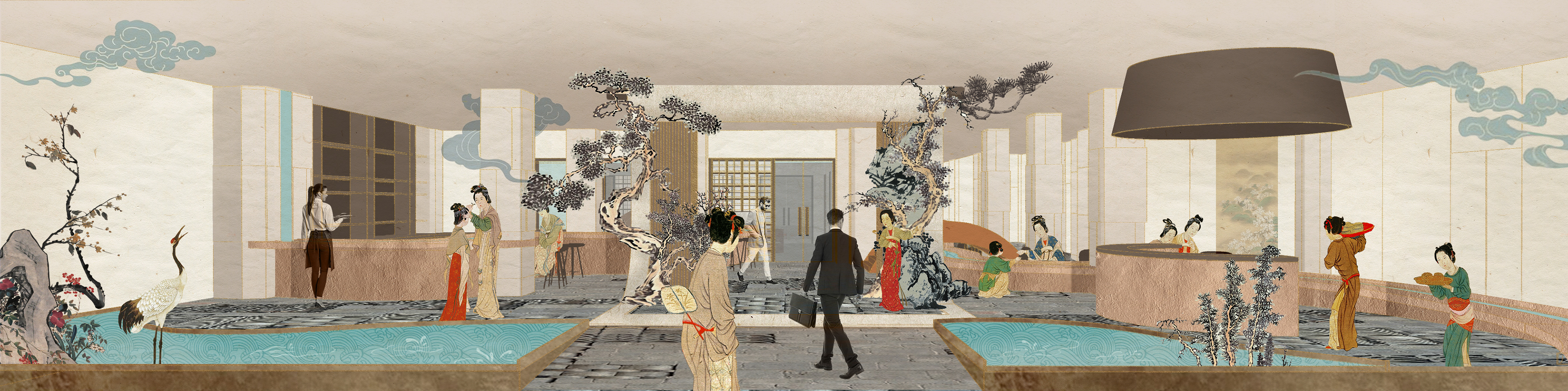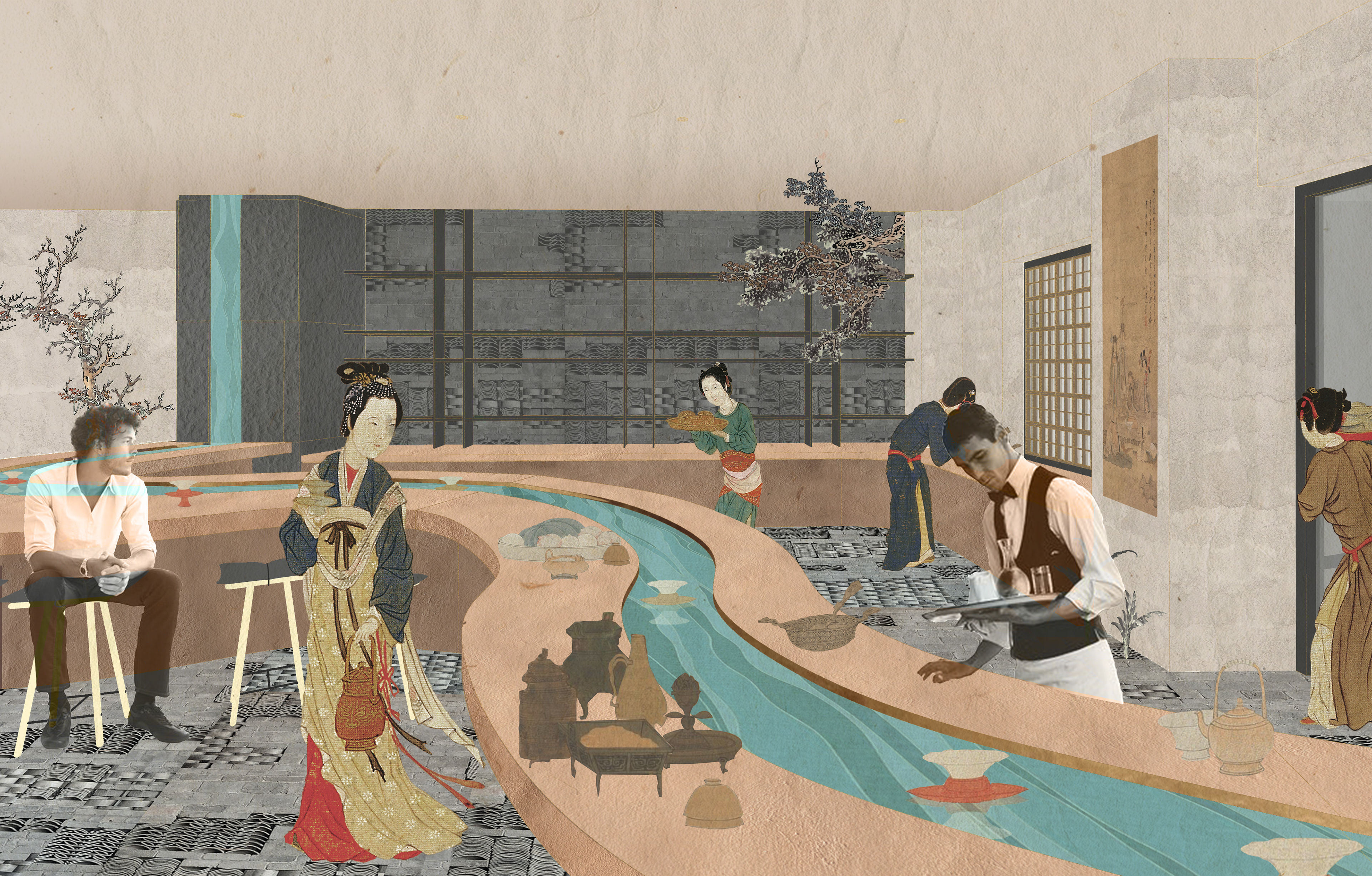 'Qu Shui Liu Shang' is an ancient Chinese poetic tradition of dining and celebration. People would sit along the banks of a winding stream, placing cups of wine or food on the water and letting them drift downstream. As the cups floated gently along the current, whoever they stopped in front of would take the cup, drink from it, or compose a poem on the spot to enhance the occasion.